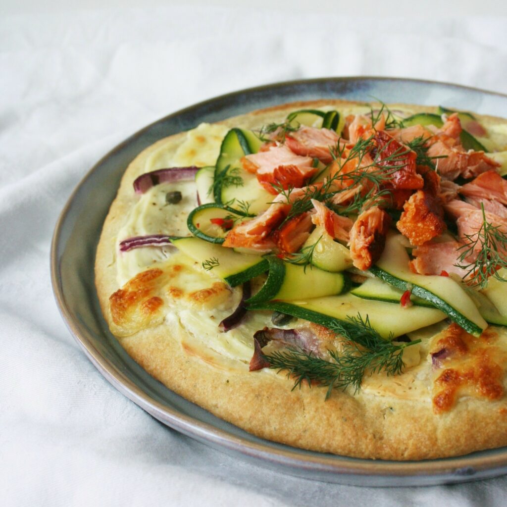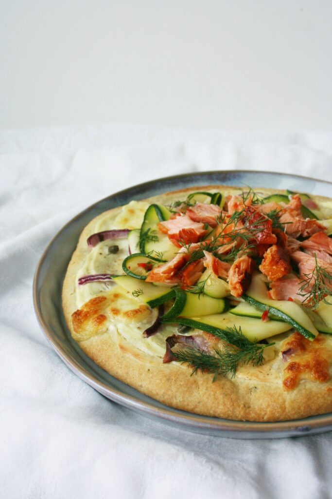 Als de pizza klaar is, verdeel je hier de courgettelinten en warmgerookte zalm overheen. Garneer de pizza met verse dille en geniet! (: