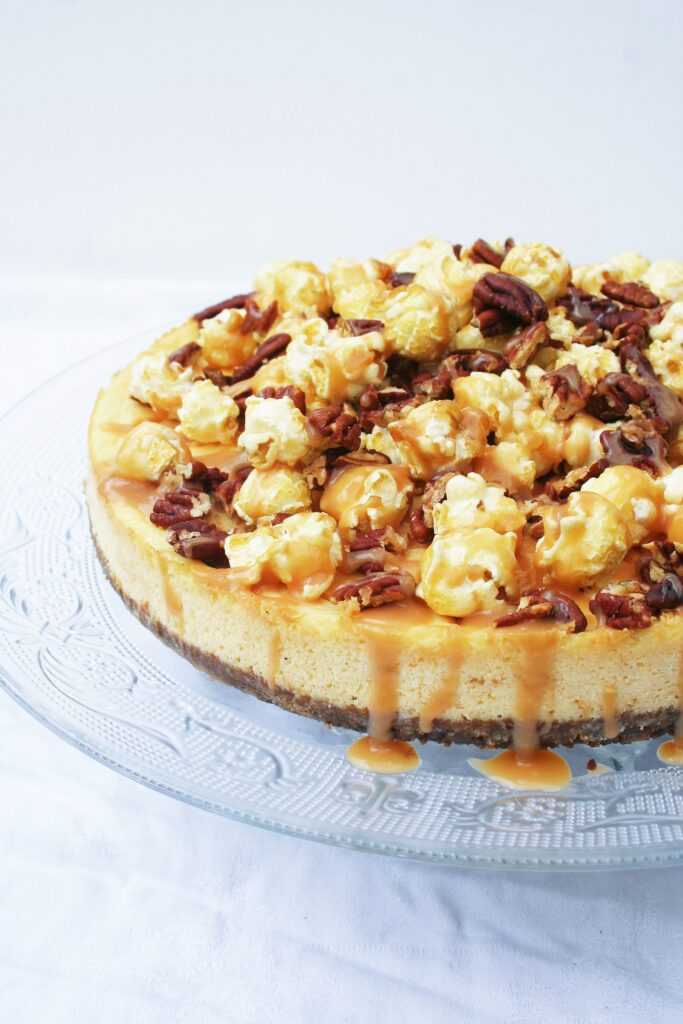 Rooster de pecannoten 8-10 minuten in de oven op 180°C. Hak de noten grof en verdeel deze samen met de popcorn en salted caramel over de cheesecake. Enjoy!