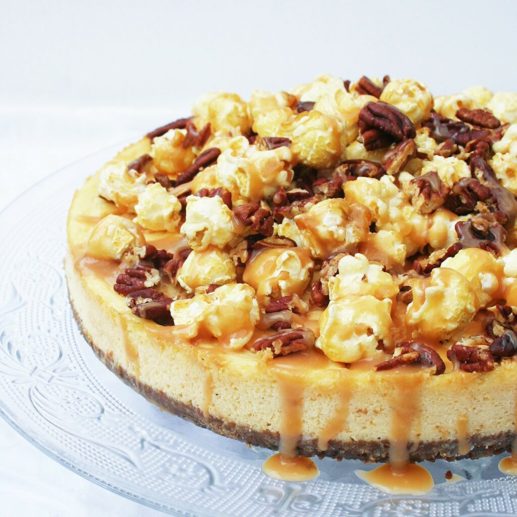 Good morninggg! Zijn jullie ook blij dat de hittegolf weer een soort van overgewaaid is? Pfoe, ik wel. Ook met die extreme temperaturen ben ik lekker door wezen bakken, maar ik moet zeggen dat dit toch wat prettiger is als niet de hele keuken als een soort levensgrote oven aanvoelt 😉 Anyways, ik heb weer een heel tof recept voor jullie! Deze salted caramel cheesecake met popcorn en geroosterde pecannoten is echt héél erg lekker! Gemaakt met een bodem van bastogekoekjes, een romige vanille cheesecake en lekker veel salted caramel.. Ik deel hieronder het recept met jullie, inclusief het recept om zelf salted caramel te maken!