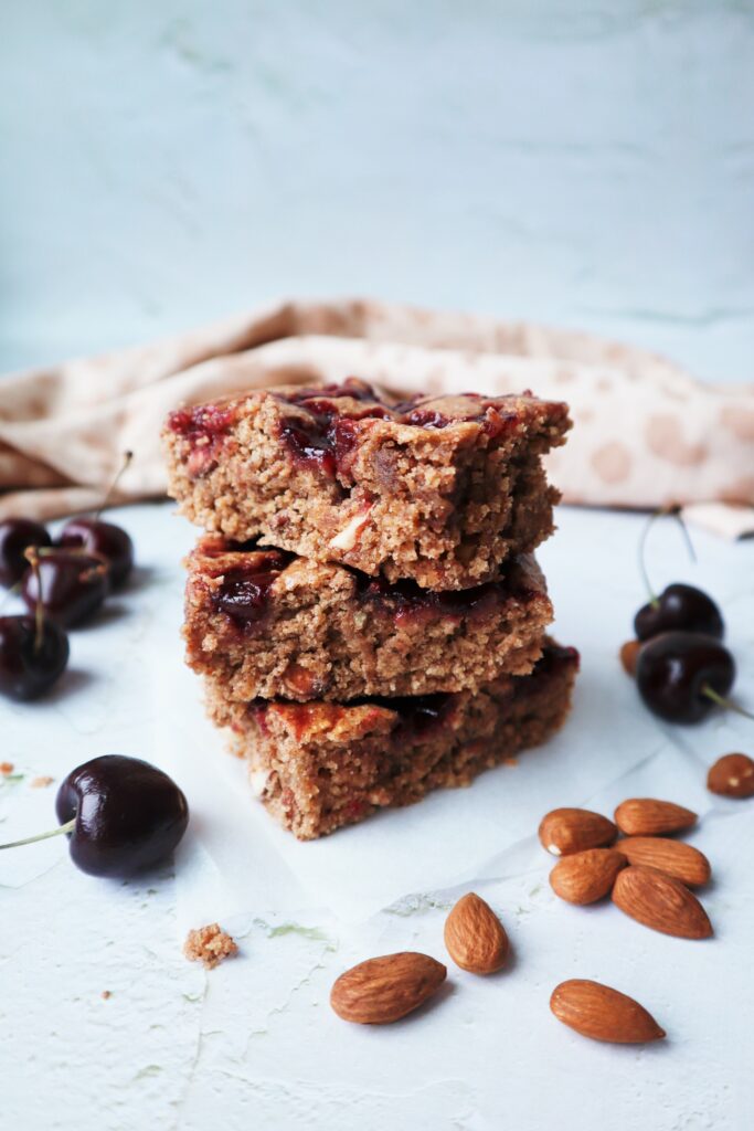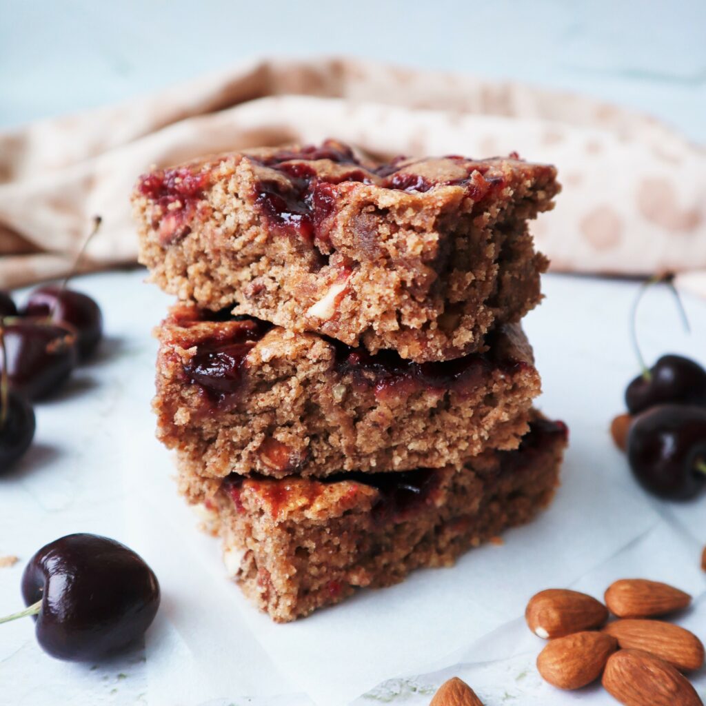 Goedemorgen! Ik merk dat ik het steeds makkelijker ga vinden om vegan te bakken en hier recepten mee te bedenken (: Zo zijn ook deze vegan blondies met kersen ontstaan! Ik maakte gebruik van amandelpasta om een lekker smeuïg beslag te krijgen, en dit geeft ook een super volle en notige smaak aan de blondies. Verder heb ik gehakte amandelen en kersencompôte toegevoegd aan het beslag, mmm! Super easy en enorm lekker! Dit is echt een blijvertje 🙂 Kijk snel hieronder voor het recept!