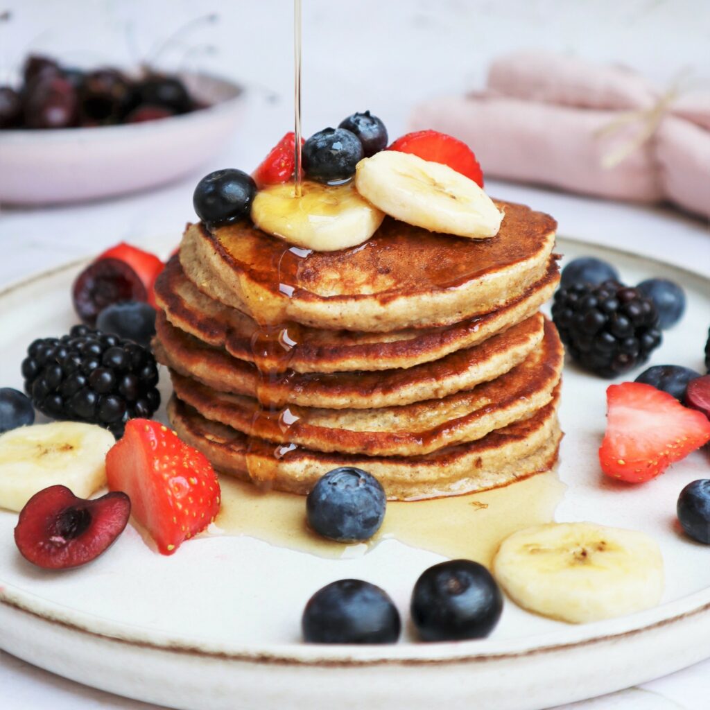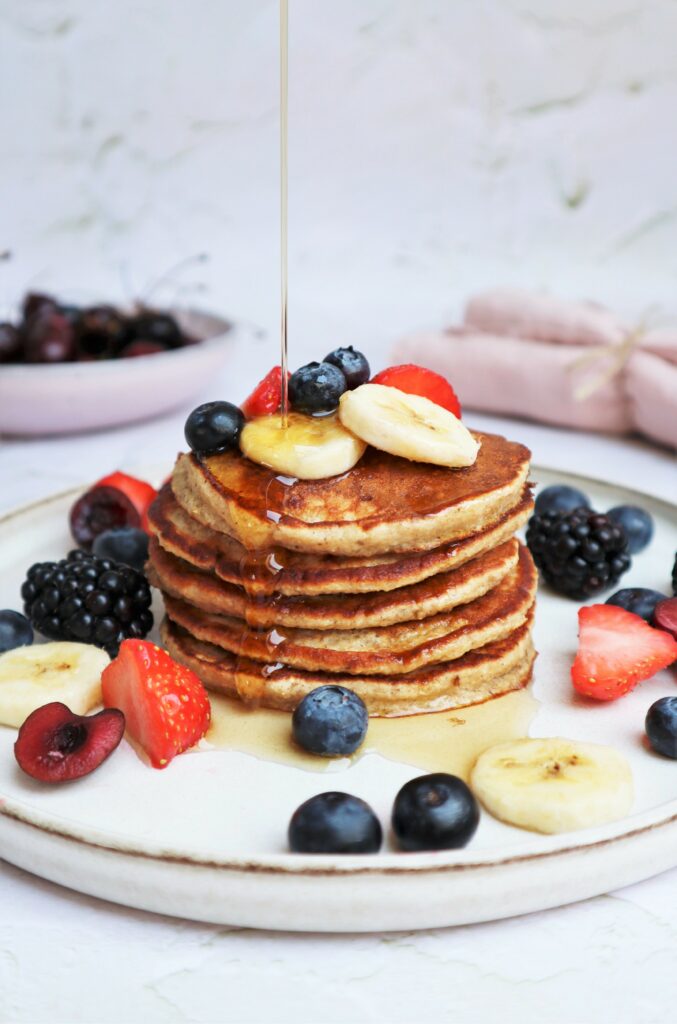 Serveer de pancakes met toppings naar keuze, ik koos deze keer voor lekker veel rood fruit en maple syrup! Maar denk bijvoorbeeld ook aan kokosflakes, cacao nibs, noten, honing.. wees vooral lekker creatief! Enjoy!
