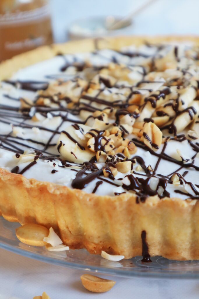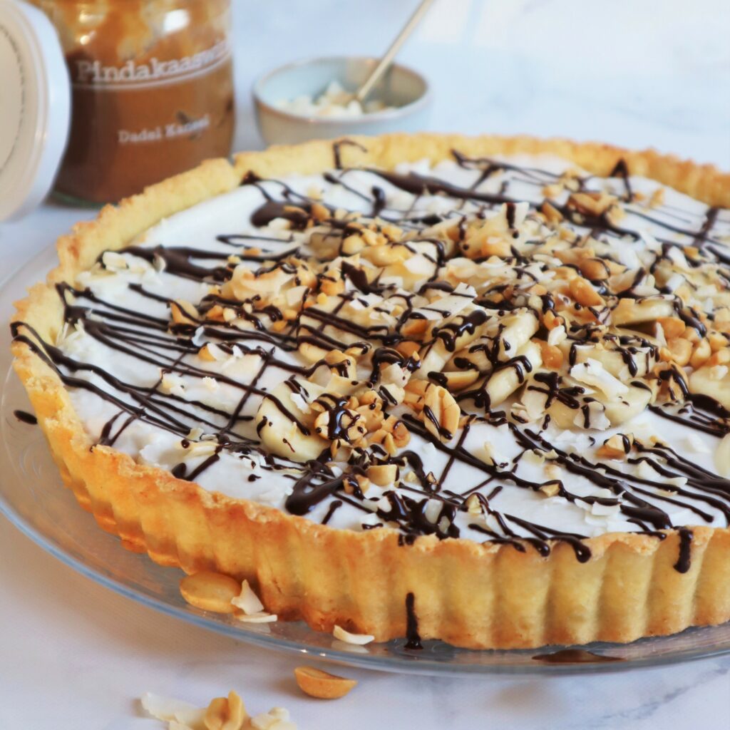 Als de bodem volledig is afgekoeld kun je de karamel over de bodem uitsmeren. Doe dit eventueel met een vochtige lepel als het uitsmeren wat stroef gaat. Snijd de bananen in plakjes en verdeel deze over de karamel. Schep de kokosroom uit de blikjes kokosmelk (echt alleen de room, niet de waterige substantie!) en klop dit op samen met de 2 el suiker. Smeer de kokosroom uit over de plakjes banaan. Top af met gehakte pinda’s en kokosflakes. Wil je ook nog een drizzle (vegan) chocolade? Smelt dan wat chocolade au bain marie, doe in een klein spuitzakje en laat dit circa 10 minuutjes in de koelkast liggen om af te koelen. Knip vervolgens het puntje van het spuitzakje en teken strepen over de taart. Tijd om te genieten, enjoy!