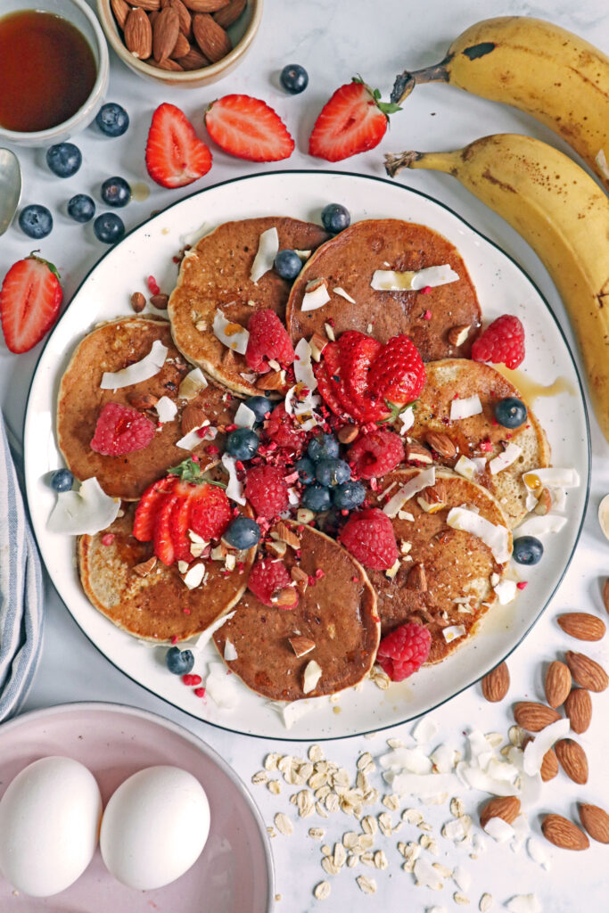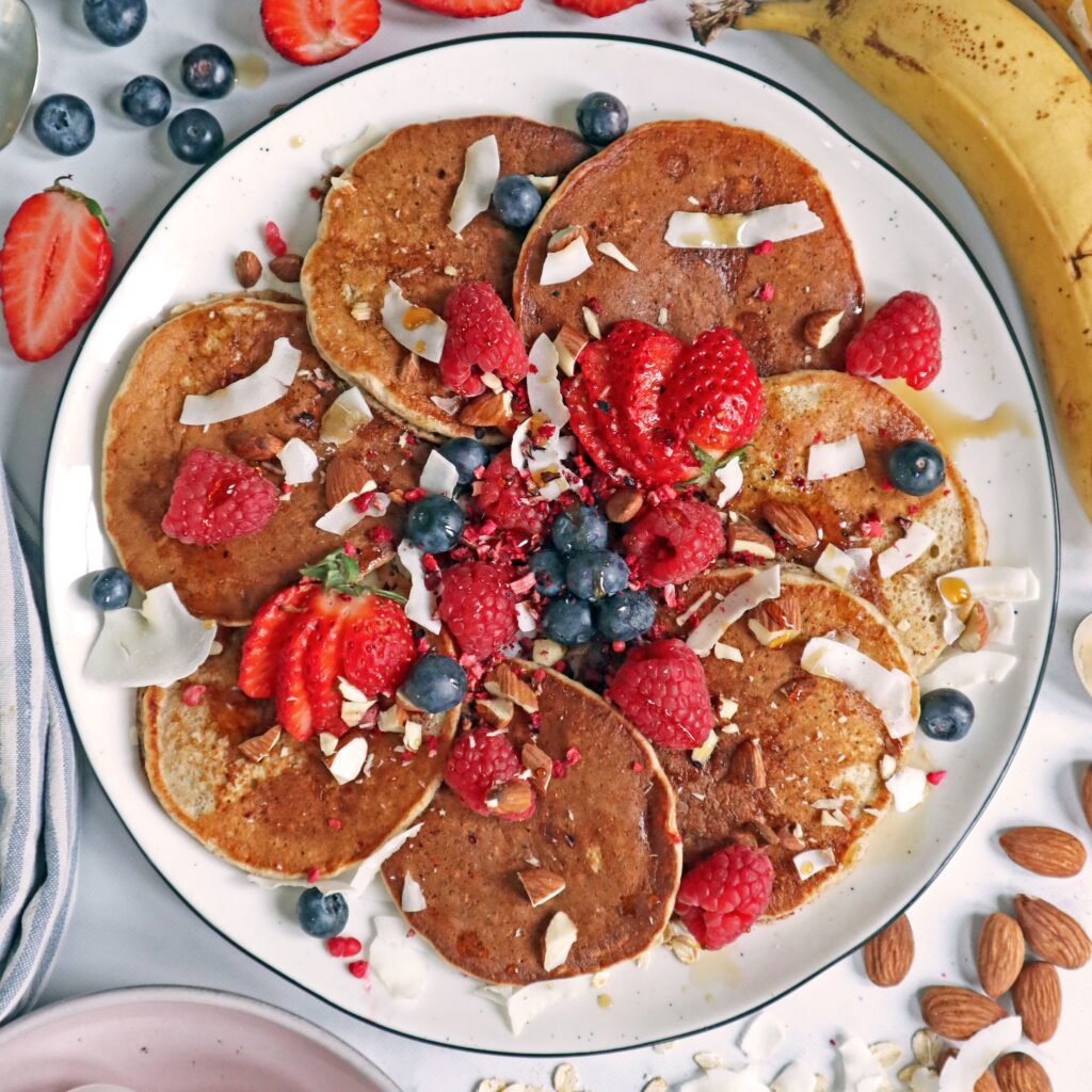 Gebruik een keukenmachine of staafmixer om het beslag te maken. Doe alle ingrediënten behalve de (amandel)melk in de keukenmachine/staafmixerkom en mix tot een fijn beslag. Laat 5 minuten staan zodat de havermout kan weken/vocht opnemen. Kijk hierna even hoe dik het beslag is en verdun zo nodig met een scheutje (amandel)melk. Het beslag moet redelijk dik zijn, zodat je kleine pancakes kunt vormen die niet uitlopen in de pan.