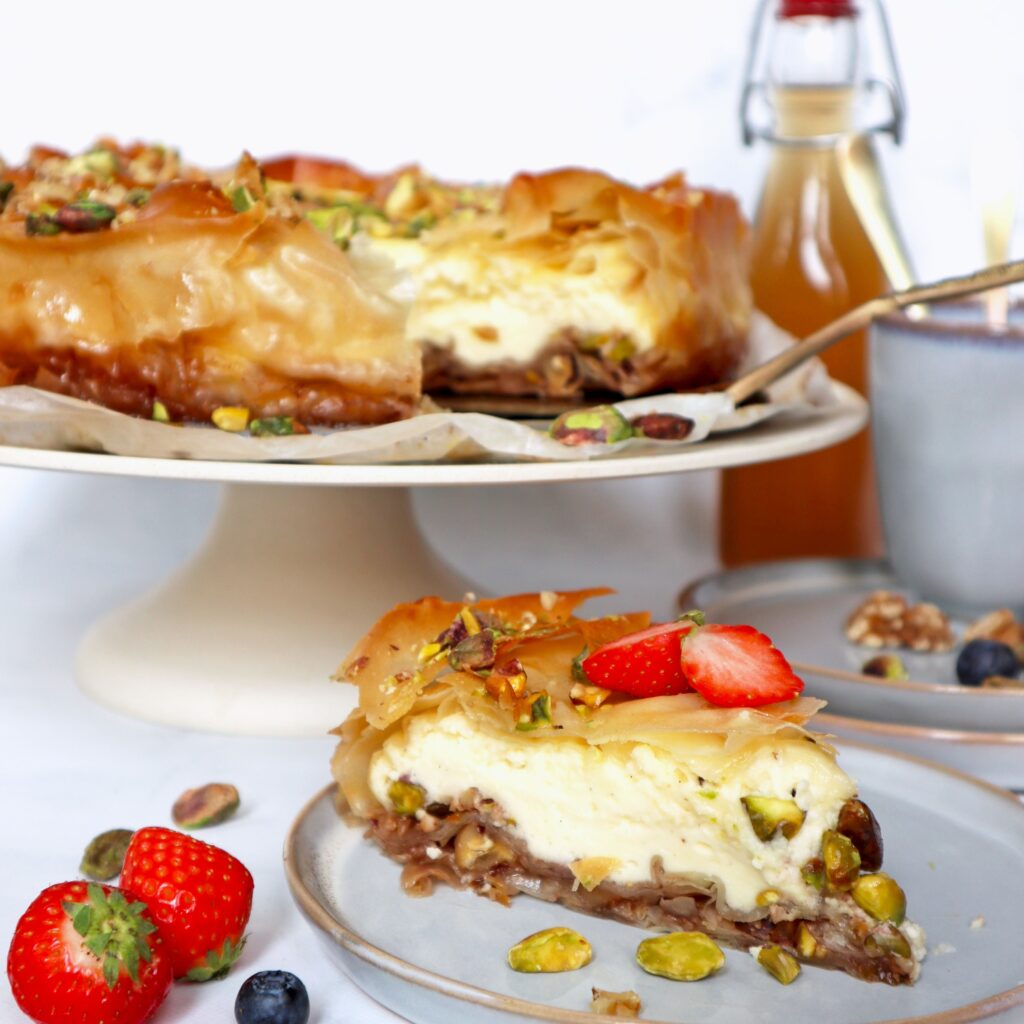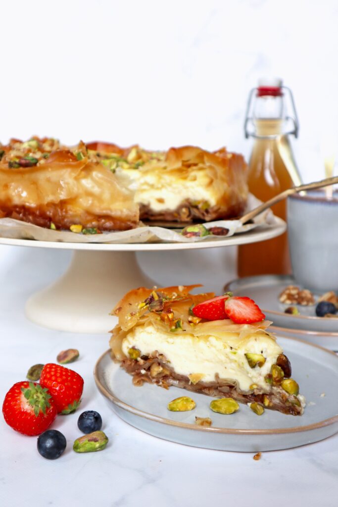 Smelt de roomboter en leg 1 blad filodeeg op je aanrechtblad. Smeer met een kwastje het deeg in met de gesmolten roomboter en leg het blad in de springvorm. Hierbij wil je dat ongeveer 1/3 van het blad ‘uit de vorm steekt’. We willen namelijk uiteindelijk het filodeeg wat overhangt naar binnen vouwen, zodat we de taart aan de bovenkant ook kunnen bedekken met filodeeg (dit zie je ook op de foto). Herhaal dit met de helft van de filodeegbladen, en plaats deze rondom in de vorm zodat de gehele vorm bedekt wordt. Verdeel dan de helft van het notenmengsel over het filodeeg. Hierna gaan we met de resterende helft van de filodeegbladeren weer hetzelfde doen; insmeren met gesmolten roomboter, de bladeren bedekken de bodem maar de uiteindes steken ook uit de vorm. Als je hiermee klaar bent, giet je de cheesecakevulling op de baklava bodem. Vouw nu de zijkanten van de filodeegvellen naar binnen. Vorm ze een beetje zodat je een mooie ronde taart krijgt. Smeer de bovenkant van het deeg in met de resterende roomboter. Bak de taart in +/- 60 minuten gaar, de binnenkant van de cheesecake mag nog een beetje wiebelen maar de buitenkant moet stevig zijn. De filodeegvellen mogen mooi bruin kleuren. Als de taart uit de oven komt, giet je de resterende suikersiroop over de taart. Hak wat extra pistache- en walnoten grof en garneer de taart hiermee. Laat de taart vervolgens in de vorm volledig afkoelen tot kamertemperatuur. Hierna plaats je de taart in de koelkast voor minimaal 2 uur.