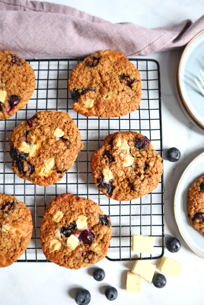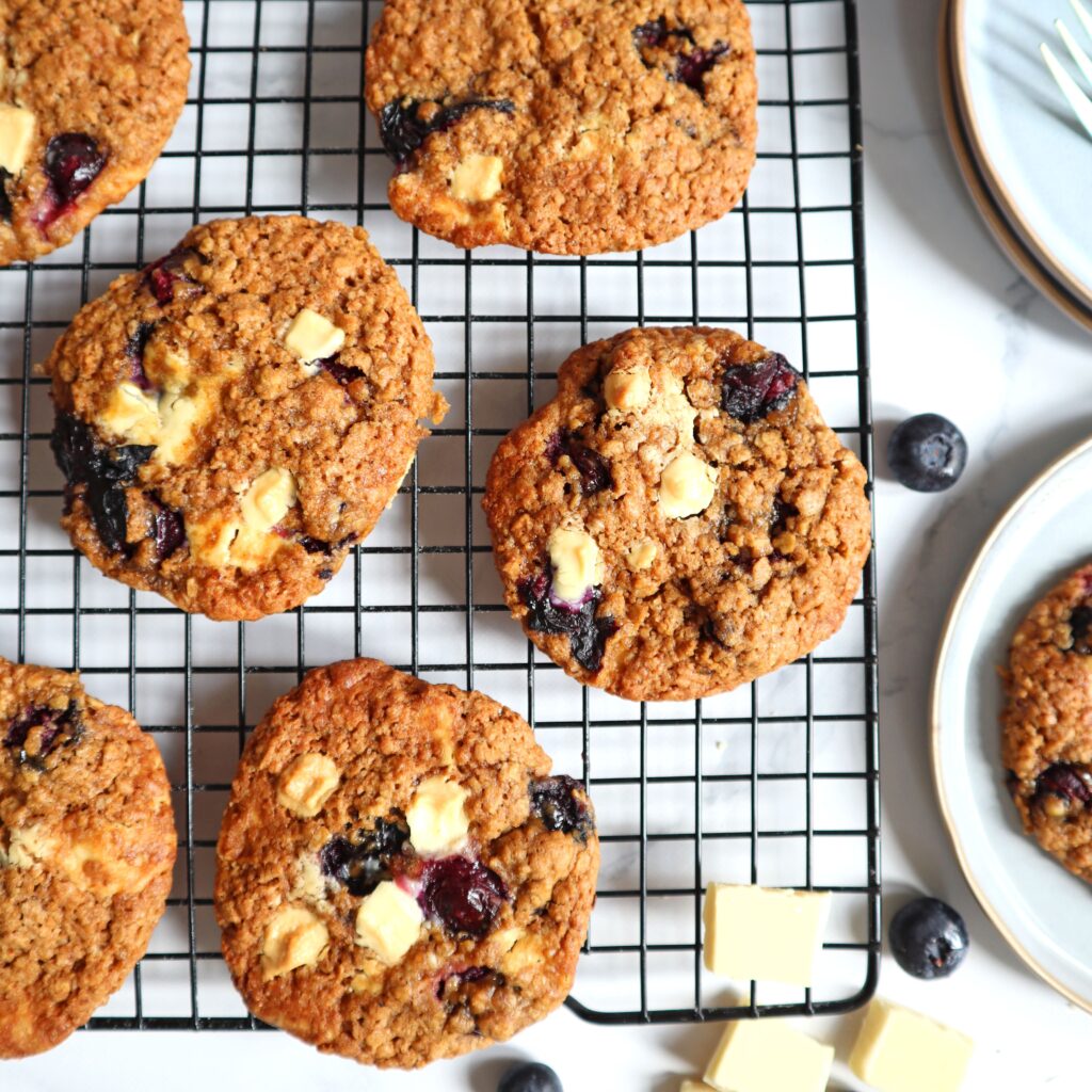 Morning! Stiekem is koekjes bakken misschien wel een van de leukste dingen om te bakken. Het is snel, lekker én je kan er super veel mee variëren! Aangezien de blauwe bessen momenteel in het seizoen zijn ging ik daarom deze keer voor blueberry cookies. Met een beetje havermout, witte chocolade én een beetje sinaasappelrasp zijn dit echt heerlijke frisse, zoete en chewy cookies geworden! En het fijne is dat ze ook nog eens binnen een uurtje op tafel staan. Klinkt goed toch? Ohja, je kan ook leuk experimenteren met andere soorten vullingen. Hiervoor geef ik nog een aantal variatietips onderaan het recept!