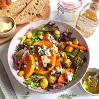 Herfst salade met pompoen, blauwe kaas en witte balsamico